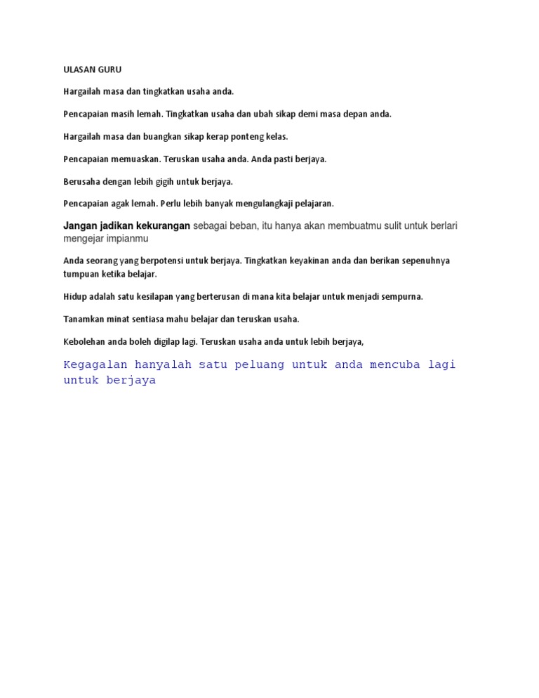 Sekalung tahniah atas kejayaan anda. Contoh Ulasan Guru Kelas Dalam Peperiksaan. Anda mesti mempunyai motivasi yang tinggi dan minat terhadap pengajaran dan pembelajaran.